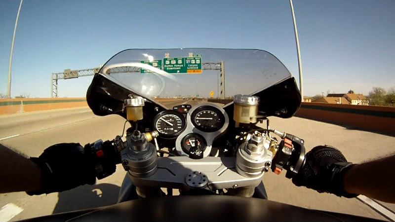 I want to use my GoPro HD camera at the track, so I fabricated a simple gas tank mount for it out of 2mm thick aluminum plate. The mount uses three of the gas cap bolt holes and positions the camera in a great spot for capturing on-bike video without getting in my way when I'm riding. There is also a small tether line in case the 3M adhesive pad fails.